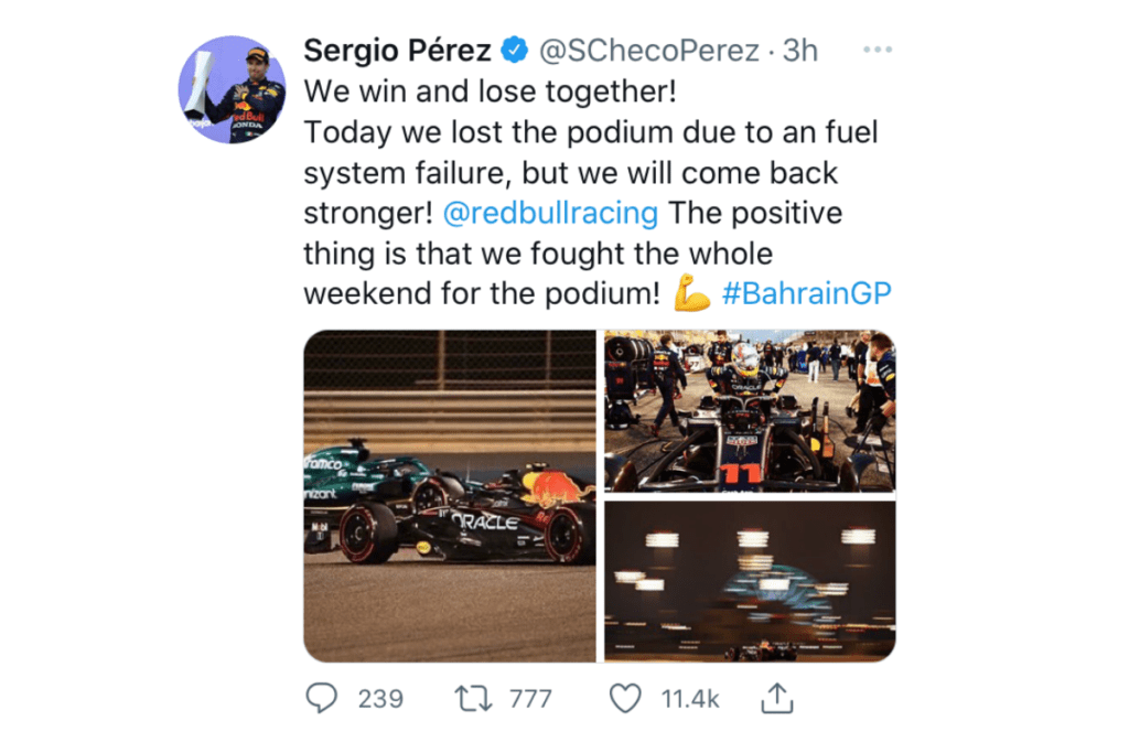 “Tuvimos el podio en el bolsillo hasta la última vuelta. Un par de vueltas antes del final pude sentir que estaba perdiendo potencia, sabíamos que había un problema y sabíamos lo que había pasado con Max (Verstappen)”.